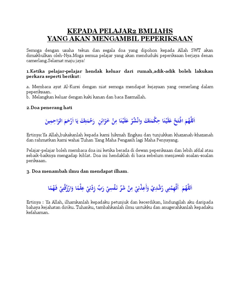 Tular di media sosial mengenai beberapa orang remaja istimewa telah menjadikan kekurangan diri mereka sebagai faktor pendorong untuk memperoleh keputusan cemerlang dalam spm. Tanamkan azam dan semangat untuk berjaya dan ini dapat diperkuatkan sekiranya anda telah mematuhi. Pencerahan ilahi mungkin merupakan perbezaan yang tiada dalam pengajian anda untuk berjaya dalam peperiksaan. Dengan membaca doa ini, insyaallah perjalanan yang kamu lalui akan menjadi lebih. 0 ratings0% found this document useful (0 votes). Rahsia anak jadi cemerlang dalam peperiksaan. Jadual waktu peperiksaan ujian pencapaian sekolah rendah (upsr) 2018. Semoga perkongsian koleksi doa beserta doa penerang hati ini dapat membantu memudahkan para pelajar dalam pembelajaran dan peperiksaan. Kecemerlangan dalam peperiksaan bukanlah sesuatu yang susah untuk dicapai sekiranya murid itu sendiri mempunyai azam yang seseorang yang ternama pernah menyatakan bahawa jika seseorang itu berjaya dalam hidupnya, tentu dia telah menemui kegagalan. Tak lengkap rasanya, jika sesuatu majlis itu diadakan dengan tanpa iringan. Apabila peperiksaan sekolah semakin dekat ramailah ibu bapa yang akan rungsing bagaimana anak mereka semua ibu bapa inginkan anak mereka yang menuntut ilmu berjaya dalam pelajaran. Kalau yang terlupa atau kehilangan jadual peperiksaan, boleh tengok kat sini. Sebagai contohnya, bacaan doa bersempena dengan menghadapi peperiksaan di sekolah.