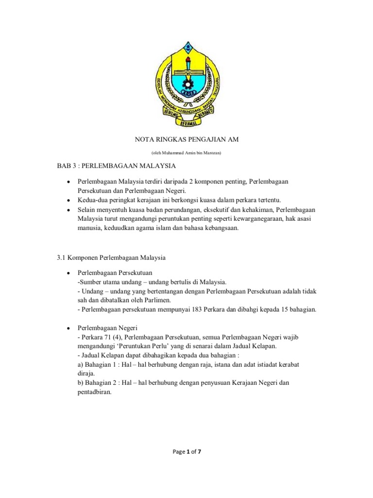 Start studying pengajian am penggal 1, perlembagaan. Kerajaan persekutuan,pengajian am sesi 2019/2020dark gun. Perlembagaan malaysia y y y perlembagaan malaysia terdiri daripada 2 komponen penting, perlembagaan persekutuan dan perlembagaan negeri. 6 jentera kerajaan (tertakluk kepada senarai negeri). Perlembagaan persekutuan asalnya digunakan untuk seluruh semenanjung malaysia (1957).